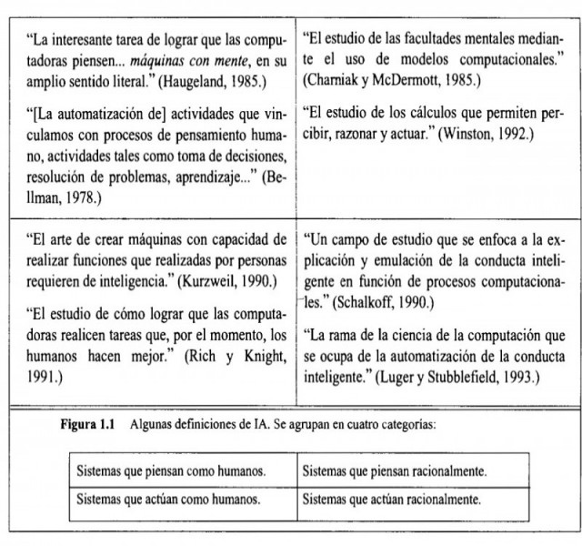 A partir de esto, se fue incursionando en el conocimiento del pensamiento humano e inconscientemente en el Artificial, los primeros avances se dieron a través de la filosofía (como se explico el origen) luego se le dio formalidad gracias a la matemática así como las ideas más importantes y la exploración de esto a través de problemas creados por ellos y sus búsquedas junto con sus descubrimientos al tratar de resolverlos. La psicología hondo en los procesos mentales que realizaban y los distintos criterios que usaban al resolver un problema. Esto fue dando forma a la necesidad de maquinas que ayudaran a facilitar cálculos siendo el Abaco la primera de esas maquinas, estas se fueron desarrollando en base a los conocimientos que se iban descubriendo (A través de la Matemáticas, Filosofía, Psicología) y que iban siendo implementados en ellas, dando forma a las computadoras electrónicas digitales, siendo en un principio creadas con objetivos militares, se le desarrollando y refinando dándoles otros fines más comunes, con esto se creó la necesidad de insertar datos que una computadora pudiera entender, por lo que crearon lenguajes con nociones lógicas para lograr programar a las computadoras de tal manera que hicieran lo que se les pedía. Las computadoras con el paso del tiempo fueron reduciéndose en tamaño y precios, pasando de ser un lujo o que solo investigadores y científicos que usaban a aparatos accesibles distintos grupos sociales y satisfaciendo distintos intereses. A través de todos los avances se fueron dando definiciones de Inteligencia Artificial con distintos enfoques, lo cual formo 2 bloques principales, por una parte se mide la condición deseable en función de eficiencia humana, mientras que por el otro lado se concentra en conformidad con un concepto de "Inteligencia ideal" denominado racionalidad como se muestra imagen de abajo.